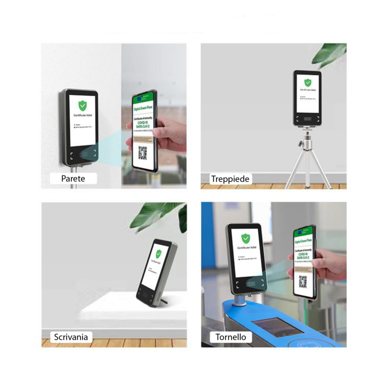 Lo Scanner si presenta già corredato di base in metallo treppiede, retro-supporto e supporto da parete, disponibili due modelli con due diversi schermi.
